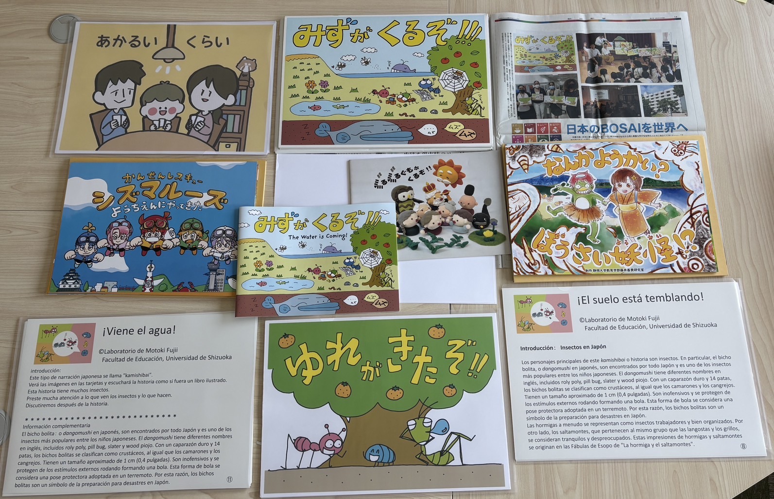 藤井研究室では、東日本大震災を契機として、研究室所属の学生とともに防災教材の開発に継続的に取り組んできました。これまでに、絵本・紙芝居あわせて7種類・9冊(英語版、スペイン語版を含む)を制作しています。