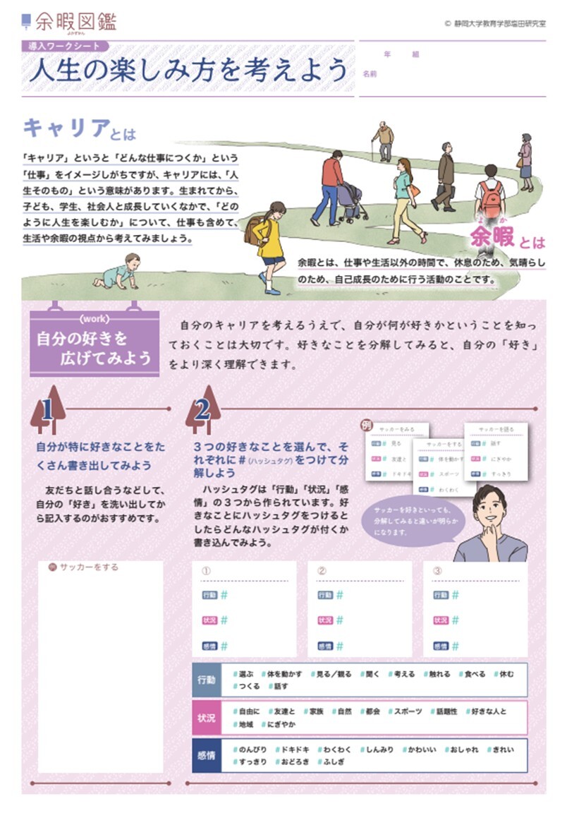 国立大学法人静岡大学(所在地:静岡県静岡市、学長:日詰一幸、以下静岡大学)は、楽器・音響機器事業を展開するヤマハ株式会社(本社:静岡県浜松市、代表執行役社長:山浦敦、以下ヤマハ)と、小学校高学年以上を対象としたキャリア教育サイト「人生を楽しむための余暇図鑑」を共同で開発し、無償で公開しています。