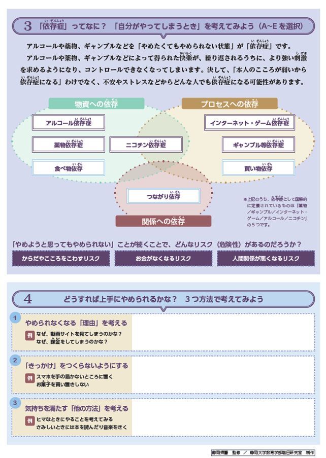 国立大学法人静岡大学 教育学部 塩田研究室(准教授:塩田 真吾)は、静岡県警人身安全少年課の監修のもと、「いろいろな依存について考えてみよう」と題した依存症予防教材を開発し、11月より無料で公開しております。